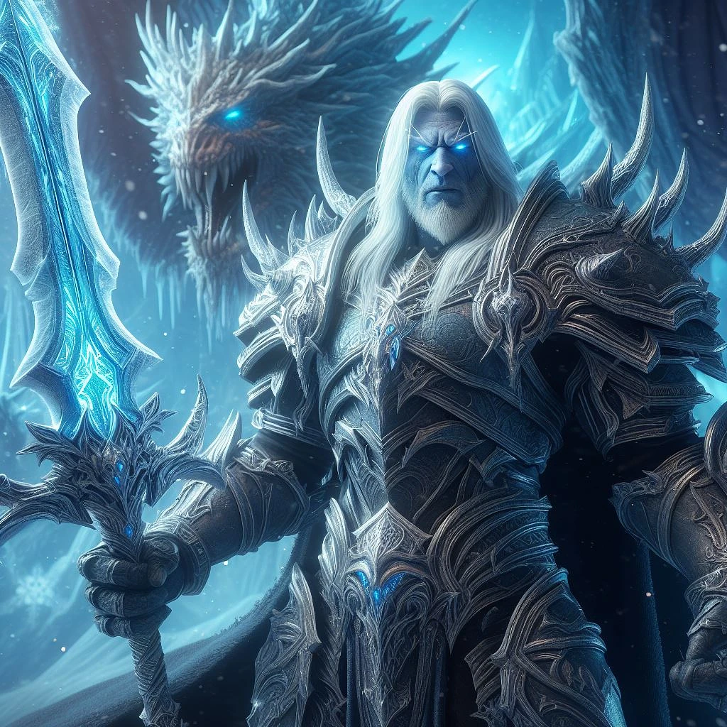 Arthas Lich King stands triumphantly in a hyper-realistic 3D portrait, his legendary runeblade Frostmourne gleaming with deadly precision. The icy atmosphere is accentuated by intricate lighting and volumetric effects, casting an eerie glow on the Lich King's armor. Behind him, the magnificent Wyrm of Frost rises in all its splendor, a breathtaking sight that adds to the epic composition of this stunning artwork