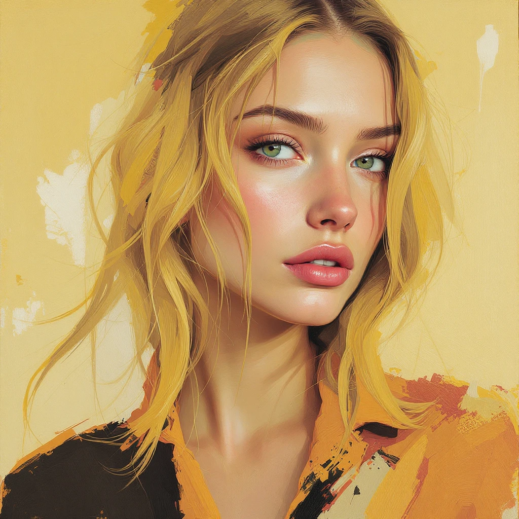 portrait of a woman with an emphasis on thick, impasto-style brushstrokes, rich, tactile paint texture, rendered in a soft, vivid palette of warm yellow, muted red, and pastel olive green, intermingled with strokes of white and black, hair flows in loose, impressionistic feel, focus on the light green eyes, painted with minimalistic yet expressive lines, reflective and serene expression, background is simplistic paint brush expression, soft hues that complement the her face without overwhelming it, portrait merges contemporary art styles with a touch of vintage portraiture, emphasizing emotion and the physicality of paint, realistic painting --ar 9:16 --style raw --stylize 300 --v 6. 1