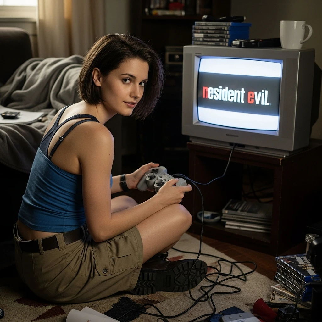 jill valentine sitting on the floor playing resident evil on an old tv using playstation controller, looking back at camera, realistic, candid amateur photograph, natural light