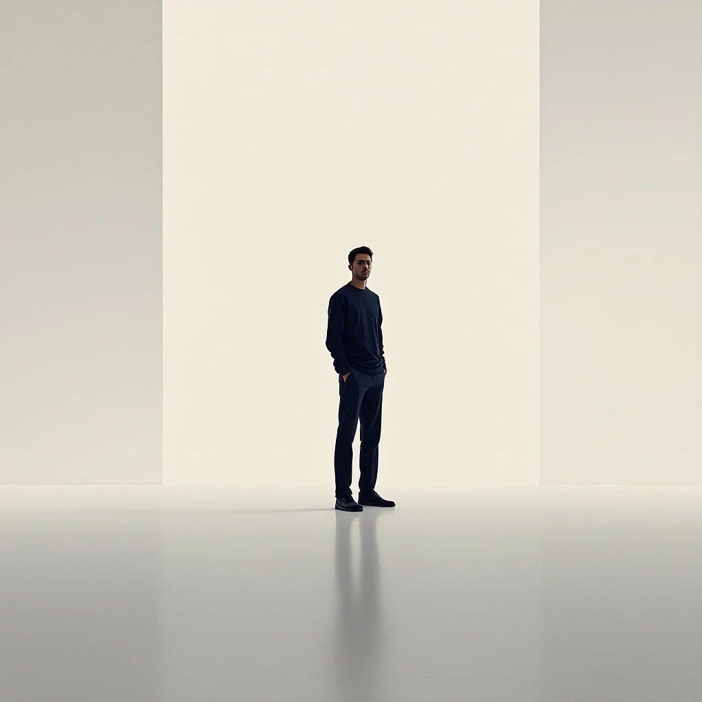 contemporary, minimalist, wide, one subject, centered, digital illustration, wide angle, head-on, low contrast, solitary man in silhouette, mid-thirties, dressed in a simple, modern outfit, his posture relaxed and introspective large, softly lit space with navy and soft white, environment is sparse and open, emphasizing solitude and contemplation, soft gradient from warm tones, creating a tranquil and ethereal atmosphere focus on the subtle interplay of weak light and shadow on the subject and surroundings, focus on texture and ambient light --ar 9:16 --style raw --v 6. 1