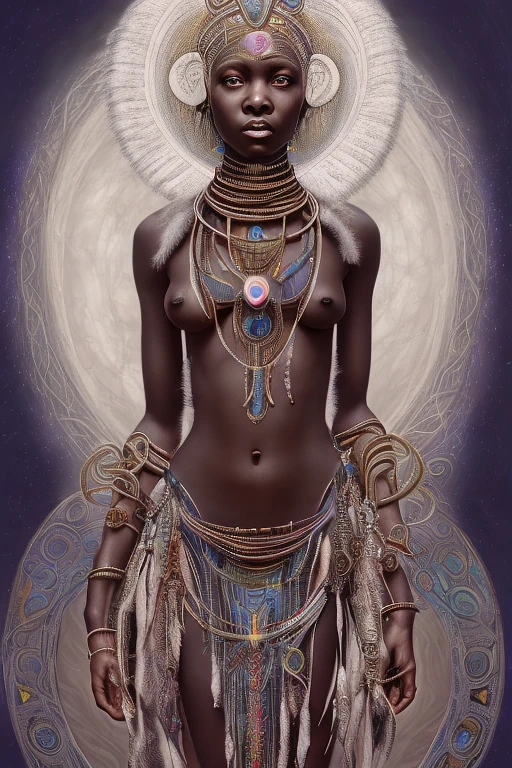 a mystical render of a single alluring mystical african tribal goddess adorned with feathers and gemstones and cables and synthesizer parts is surrounded by sacred geometry made from elven architecture, full body, gorgeous, perfect face, powerful, cinematic, beautifully lit, by artgerm, by karol bak, 3 d, trending on artstation, octane render, 8 k