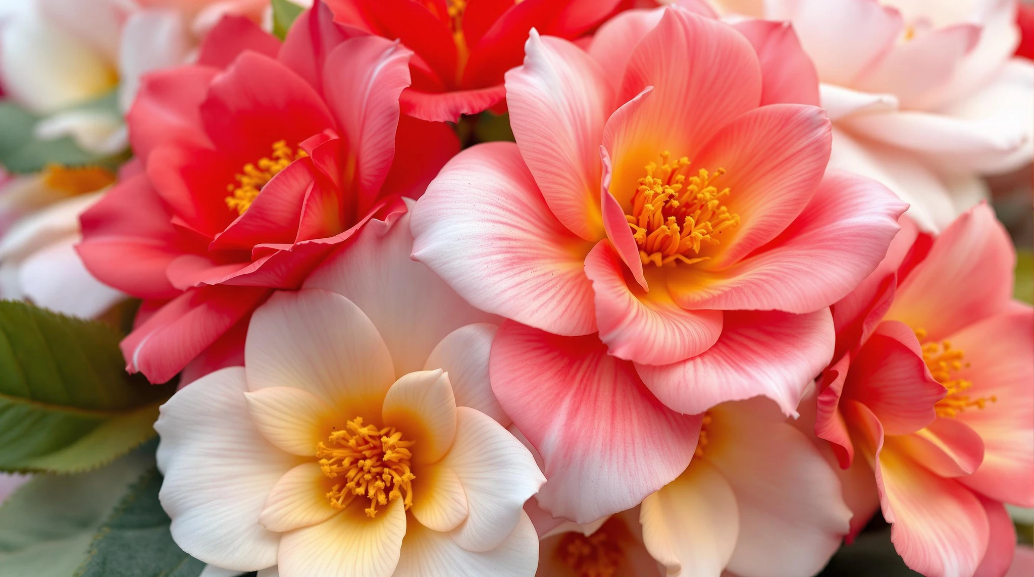 an hybrid 3d fictive flowers, close up, rose x camelia, the flowers are in a gradiation of white, ruby red and yellow tones, the composition of the colors should evoke a sense of passion for valentine day , uhd 8k