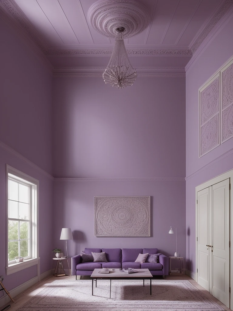 High resolution photography interior design, badroom, modern furniture and decoration, high ceiling, purple pastel palette, interior design magazine, cozy atmosphere; 8k, intricate detail, photorealistic, realistic light, wide angle, kinkfolk photography, A+D architecture