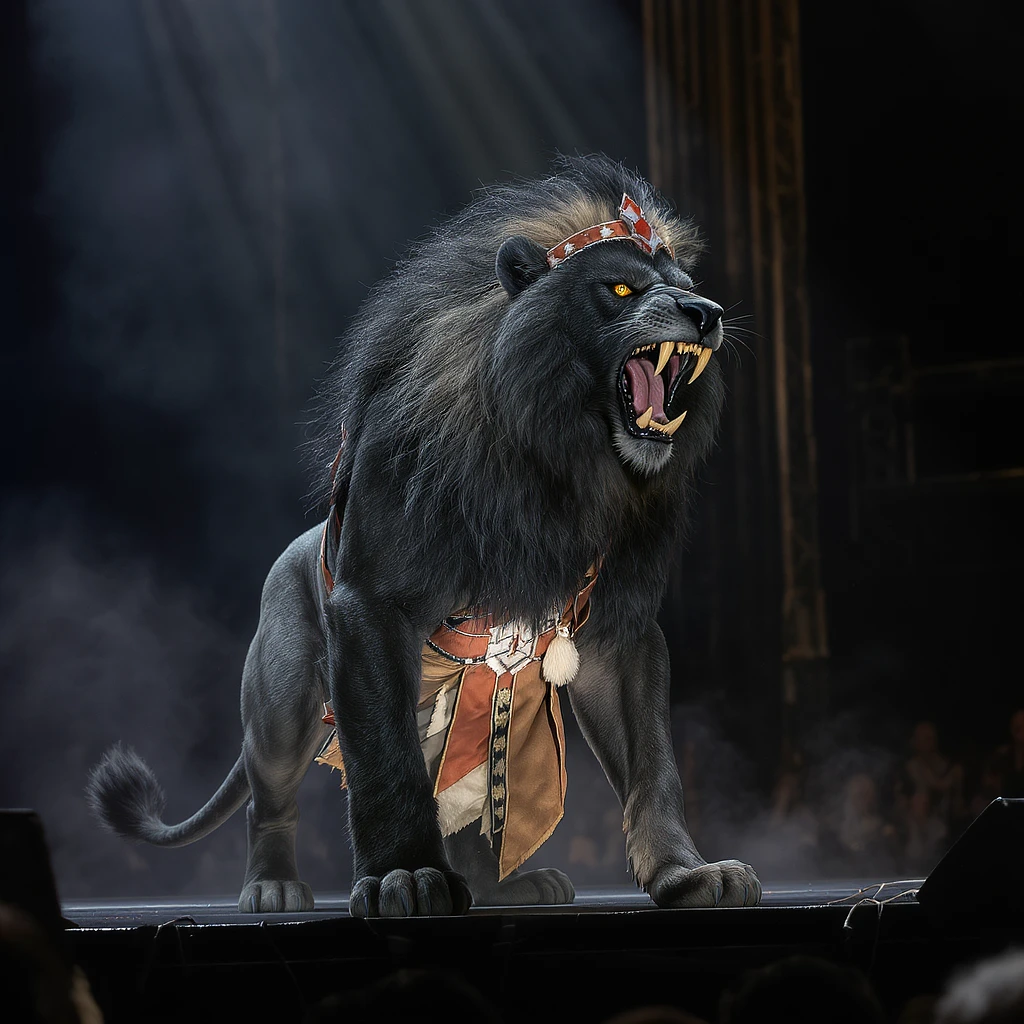 A humanoid black werewolf roaring with fierce golden eyes, standing confidently on a concert stage under dramatic spotlight. The lion has a powerful, muscular build and is dressed like atraditional african chief