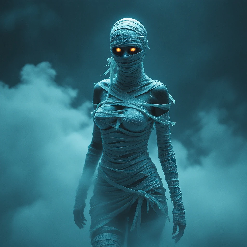 SEXY MUMMY, full body, loose bandage, science. fiction, dark synthwave style,   fog, glowing dead eyes of a woman, retro movie poster art, alpha and omega, dust, dramatic lighting, artstation, 9k Red Lights , alberto seveso art, sillhouette, water ink, ink water, ink cloud, alberto seveso art, loose, intricate detail, beautiful woman, cinematic lighting, octane render, 8k render, volumetric lighting