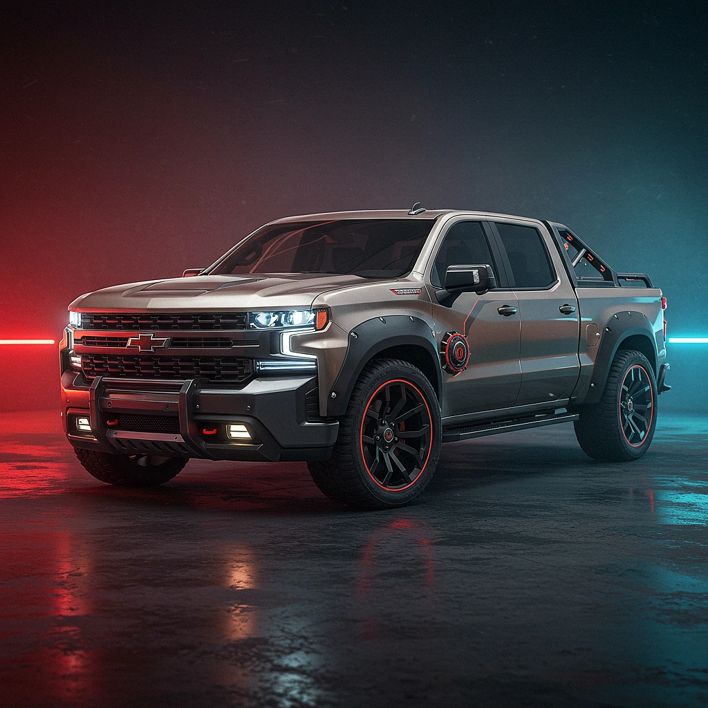 futuristic 2027 Silverado concept design blending steampunk and Cyberpunk 2077 aesthetics features a sleek, reshaped front end, mechanical detailing, neon-lit accents, and a rugged yet high-tech vibe think retro-futuristic with exposed gears, glowing cybernetic elements, and an aggressive, altered silhouette.