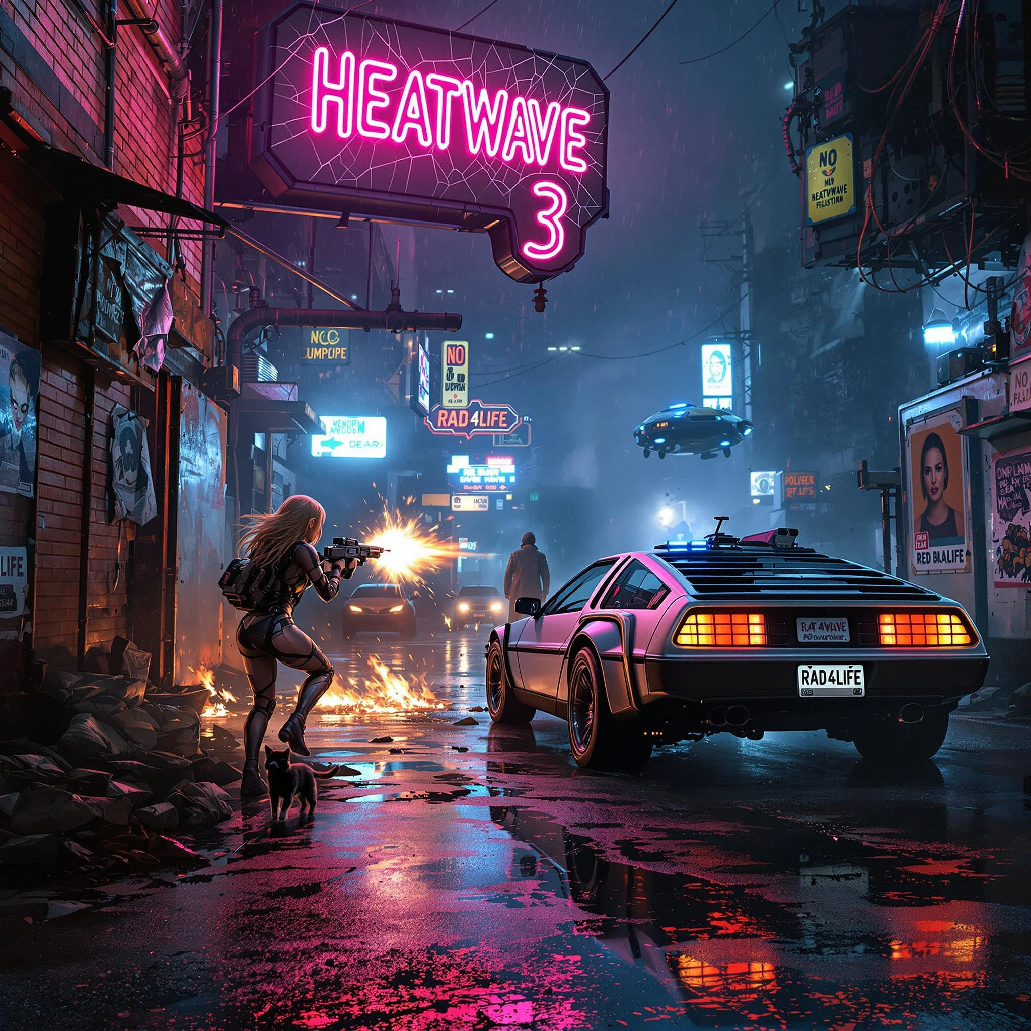 A hyperrealistic 8K cinematic masterpiece blending the gritty, neon-soaked aesthetic of a cyberpunk 1980s Tokyo alleyway with the intense action of a high-tech, futuristic battle. The scene unfolds in a dark, chaotic urban sprawl, alive with swirling fog and flickering neon lights that cast erratic, vivid glows of pink, blue, and fiery amber onto weathered brick walls and reflective puddles on the wet pavement. The alleyway is an oppressive portrait of urban decay: overflowing dumpsters with dented lids spill refuse across the ground, including torn garbage bags revealing rotting food and broken bottles. Murky, oily puddles form near rusted trash cans, reflecting the distorted neon signs above. A tattered "NO DUMPING" sign clings to a graffiti-covered wall near a massive, grimy, torn poster of a grinning model advertising a long-forgotten product. The air is thick with the smell of damp concrete, mold, and decay, immersing the viewer in this oppressive environment. Above the chaos, a cracked neon sign reading "HEATWAVE" flickers erratically, with letters inverted to resemble mirrored "3"s. The distorted lettering creates an unsettling effect as the buzzing neon tubes pulse in pink and blue. Sparks rain down from the broken sign, casting faint, glowing embers into the smoky abyss. Prominently in the foreground is a brushed silver DeLorean, its iconic lines covered with streaks of dirt and soot. The taillights glow red and amber, mirrored in the puddles below. On its license plate is the text “RAD4LIFE” boldly emphasized in capital letters. In the middle ground, a terrified stray cat leaps from an overturned trash can, eyes wide in fear, its matted fur flying. Nearby, shadowy figures lurk—a hooded figure crouches behind a dumpster with a weapon, while another leans against the wall, half-hidden by the swirling smoke, radiating menace. In the distance, a small dog sprints away, tail tucked, disappearing into the foggy shadows. A hyperrealistic 8K cinematic scene set in a gritty, neon-drenched alleyway, blending the chaotic streets of 1980s Tokyo with a high-tech cyberpunk future. The setting is alive with swirling fog and glowing neon signs, casting erratic hues of pink, blue, and fiery amber across the rain-slick pavement. The alley is a battlefield of chaos and decay: dented dumpsters overflow with garbage, their contents spilling onto the wet ground, while torn, grime-coated posters cling to graffiti-covered walls. A toppled trash can leaks murky liquid into a spreading puddle, reflecting shattered glass and the glow of broken neon lights above. The air is thick with tension, punctuated by distant sirens and the rapid crackle of gunfire. Dominating the scene is an intense standoff. A futuristic female android, crouching behind a burning car, wields a glowing laser gun with precision. Her metallic body glistens with rain and neon reflections, every joint and panel rendered in stunning detail. Her long hair flows as if caught in an unseen breeze, illuminated by the glowing barrel of her weapon as she fires off radiant blue energy bolts. The shots light up the alley with searing intensity, illuminating her fierce, glowing blue eyes locked in combat. Opposing her is a team of heavily armed gang members, dressed in rugged, cyberpunk-style attire with glowing visors and high-tech weapons. They take cover behind rusted dumpsters and walls, returning fire with bursts of tracer ammunition that streak through the smoky air. One gang member is mid-fall, struck by her precise shot, as sparks and smoke erupt around him. Adding to the chaos, two police officers in tactical gear emerge from the shadows, advancing cautiously while taking cover. Their faces are illuminated by the blue and red strobe lights of a patrol hovercraft hovering above the alley. One officer fires a futuristic shotgun-like weapon that ejects glowing shells, while the other communicates over a crackling radio, calling for backup. In the midst of the action, the setting comes alive with detail: a broken neon sign reading "HEATWAVE, " its letters inverted to resemble mirrored "3"s, buzzes and flickers erratically, raining sparks onto the battlefield below. A silver DeLorean, streaked with grime and battle scars, is parked haphazardly, its fiery taillights cutting through the haze. The license plate boldly reads "RED BEAR RAD. " The foreground tells its own stories: a frightened stray cat leaps from a trash can, its fur bristling in terror, while a small dog bolts through the chaos, disappearing into the neon haze. In the mid-ground, a bystander in a trench coat crouches low, clutching a briefcase, their face a mask of fear as they attempt to stay out of the line of fire. The scene is alive with cinematic tension, a perfect blend of action, cyberpunk aesthetics, and gritty urban chaos. It captures the relentless energy of a future where battles unfold amidst neon glow, smoke, and the relentless decay of a dystopian world. In the foreground, a stunning female android combatant crouches within a glowing circle of light, her sleek metallic body rendered with intricate, photorealistic detail. Her long, flowing hair moves as if caught in a gentle breeze, illuminated by particles of light and fiery sparks from a massive electrical discharge behind her. Her piercing blue glowing eyes lock onto the viewer with an aura of unrelenting power and readiness, embodying the fusion of elegance and lethal precision. Beside her, an iconic DeLorean, a symbol of retro-futuristic design, stands amidst the chaos, under siege by two hovering attack helicopters armed with M134 Miniguns. Streams of tracer ammunition pierce through the thick, swirling smoke, creating arcs of fiery destruction that illuminate the urban battlefield. The DeLorean's brushed silver metallic body gleams with reflected light from the surrounding neon signs, skyscraper silhouettes, and burning wreckage. Its taillights—one a fiery red and the other an amber hue—cut sharply t