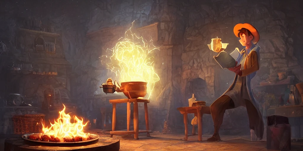 a wholesome animation key shot of wizard with a hat coocking the magical brew that emmits sparklings in pot at fireplace, medium shot, pixar and disney animation, sharp, rendered in unreal engine 5, anime key art by greg rutkowski, bloom, dramatic lighting