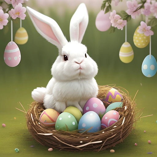 Photo of a ultra realistic cute fluffy bunny, sitting together with an cute chicken in a nest, surrounded by colorful easter eggs in a beautiful spring nature