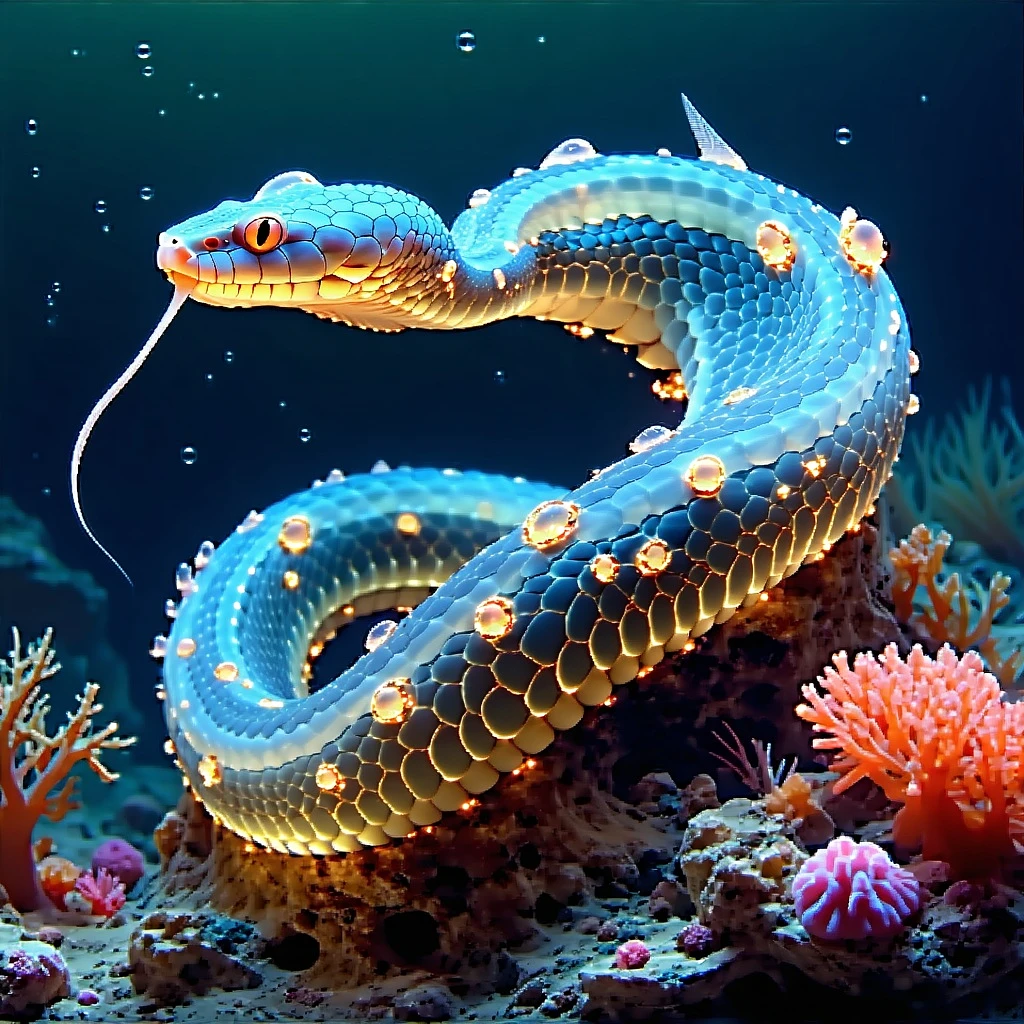 long serpentine sea creature with coral growths along its spine, translucent fins, opalescent scales, glowing coral polyps, winding through colorful reef structures, vibrant underwater palette, elegant and mysterious, fantasy marine creature concept art