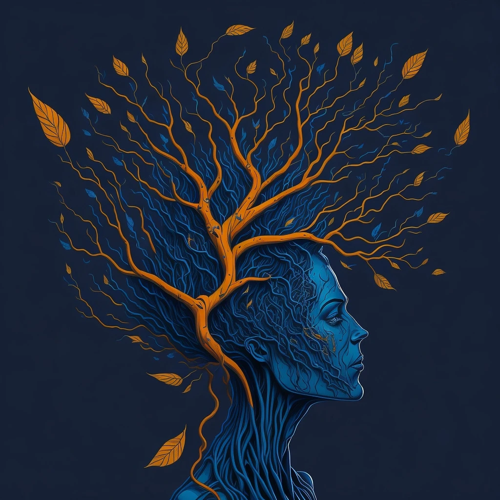 a colorful digital artwork of a woman's brain and branches, in the style of Patrick Nagel , graceful surrealism, depictions of urban life, dark sky-blue and orange, portraitures with hidden meanings, caricature-like illustrations, metropolis meets nature --ar 69:128 --s 750 --niji 5