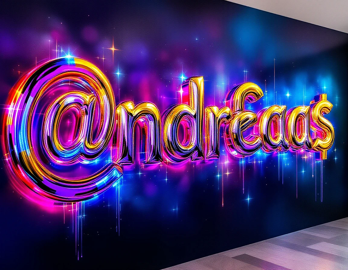 A breathtaking hyperrealistic oil painting titled "Electric Synergy" featuring the stylized name "@ndr€@$" as its centerpiece. Each character glows with vibrant contrasting colors against a deep midnight blue to rich purple gradient background. The special characters @, €, and $ shimmer with exquisite metallic gold and silver highlights that catch the light dramatically. The letters appear three-dimensional with meticulous shadow work creating impressive depth. Visible brushwork and paint textures add tactile realism to this typographic masterpiece. The artwork combines the distinct styles of James Jean and Jeff Koons, merging elegant typography with contemporary pop sensibilities. Captured under professional gallery lighting that accentuates every detail, the painting exemplifies photorealistic technique at its finest, with stunning 8K clarity revealing the artist's extraordinary precision and craftsmanship.
