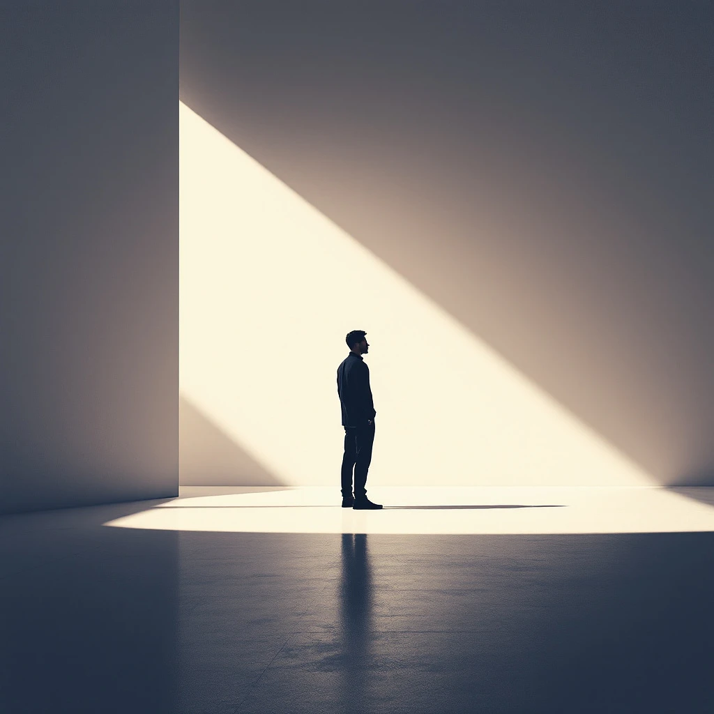 contemporary, minimalist, wide, one subject, centered, digital illustration, wide angle, head-on, low contrast, solitary man in silhouette, mid-thirties, dressed in a simple, modern outfit, his posture relaxed and introspective large, softly lit space with navy and soft white, environment is sparse and open, emphasizing solitude and contemplation, soft gradient from warm tones, creating a tranquil and ethereal atmosphere focus on the subtle interplay of weak light and shadow on the subject and surroundings, focus on texture and ambient light --ar 9:16 --style raw --v 6. 1