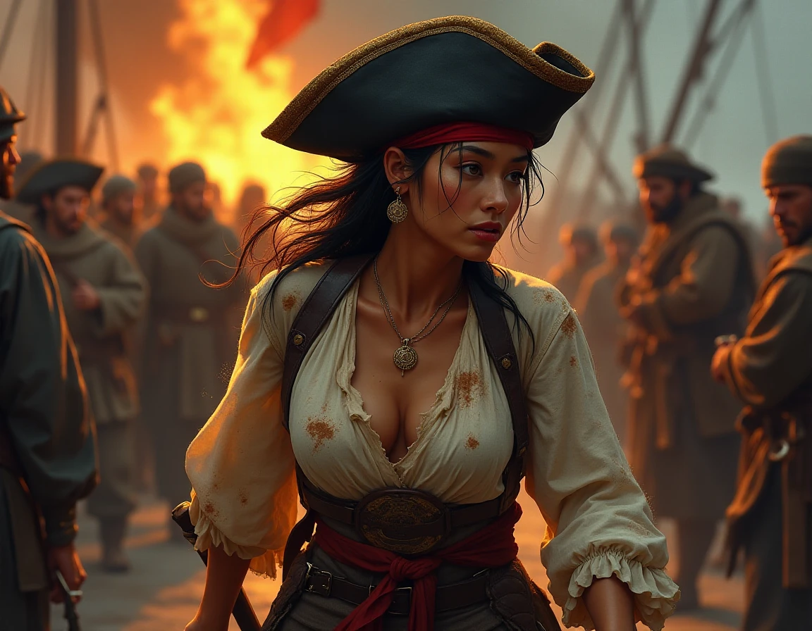 digital painting, portrait of a chinese pirate woman moving in a hurry, she looks tired, sweaty, drops of sweat on face, small breasts, wears ((dirty and crumpled clothes) ), looking at side, tricorne hat, bandana, gold circle earring, ( (large brown stains and streaks on clothes) ), holding a cutlass , standing on deck of burning ship, pirates wearing rags standing in background