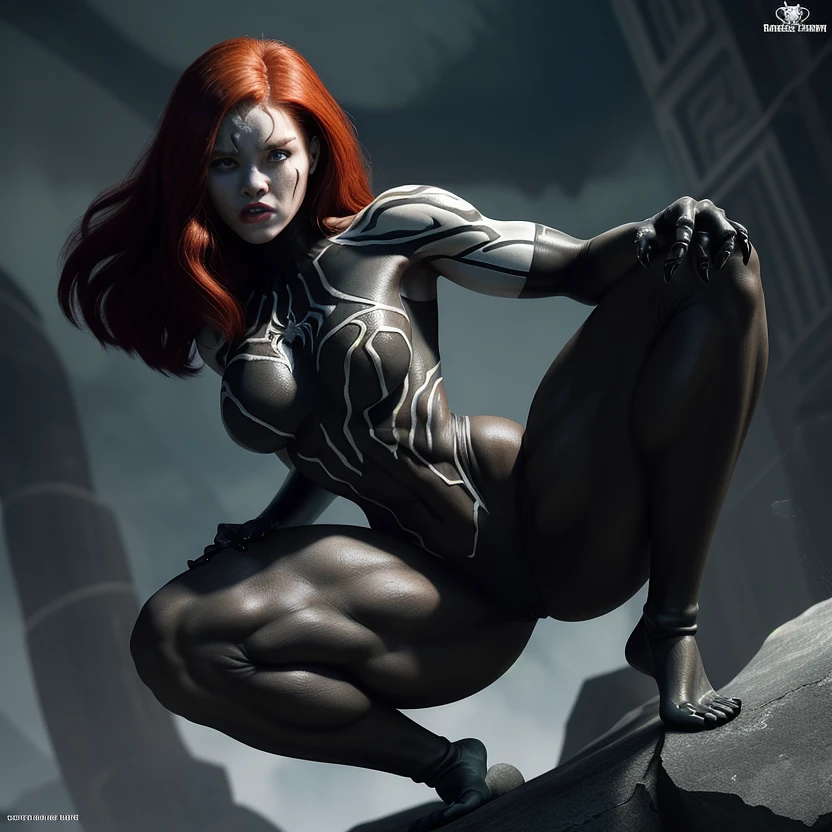 Mary Jane Watson as a huge bodybuilder transwoman wearing her black with white symbiote symbol Spider-Man symbiote, muscular, red hair, clean face, feminine face, wide jaw, 2d, feet visible, big arms, bodybuilder pose, detailed large green eyes, wide body, thick body, hype muscles, crouching with back towards the viewer, visible ass, youthful face, relaxed face expression, soles visible, big ass, sexy face,