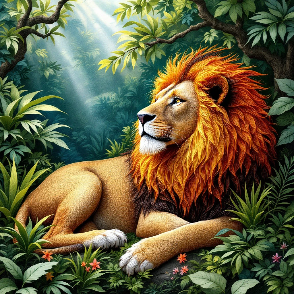 A stunning quilling art piece depicting a magnificent lion resting in the jungle. The lion's mane is intricately crafted with vibrant shades of orange, yellow, and brown, giving it a lifelike appearance. The lion's body is composed of delicate paper strips, showcasing its powerful muscles and graceful posture. The jungle background is filled with lush green foliage, with various shades of green and hints of other colors to represent different plants and trees. The sunlight filters through the dense canopy, casting dappled shadows on the lion and the surrounding vegetation, creating a serene and majestic atmosphere.