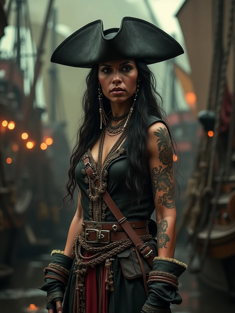 Full body view A commanding Native Caribbean pirate captain stands tall amidst the Pirate City of Lost Ships, her fierce expression and intricate tattoos reflecting chaos. Dramatic side lighting adds intensity to the scene, blending natural and futuristic elements. Wearing traditional pirate Captains Clothing and hat as depicted as Captain Jack Sparrow, hyper realistic photography, ultra realistic skin texture