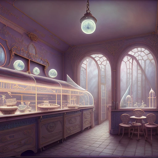 perspective, interior, curious old secret ice cream shop of the fairies, victorian, animation art, fantasy, translucent color wash, serene, cinematic, smooth, detailed, soft palette, hyperrealism, very small aperture, clear reflection, post production, post-processing, 8k, retouch, HDR, Super-Resolution, Soft Lighting, Ray Tracing Global Illumination, Crystalline, Lumen Reflections :: --style Howard Behrens --style djamilaknopf --style ghibli::1. 7 --style François Schuiten :: animated by Madhouse INC, by Studio Trigger, CGI, unreal engine 5, zelda, vray render, Procreate, Trending on Pixiv and artstation and pinterest --ar 9:15 --s 3700 --c 7 --v 3 --q 3