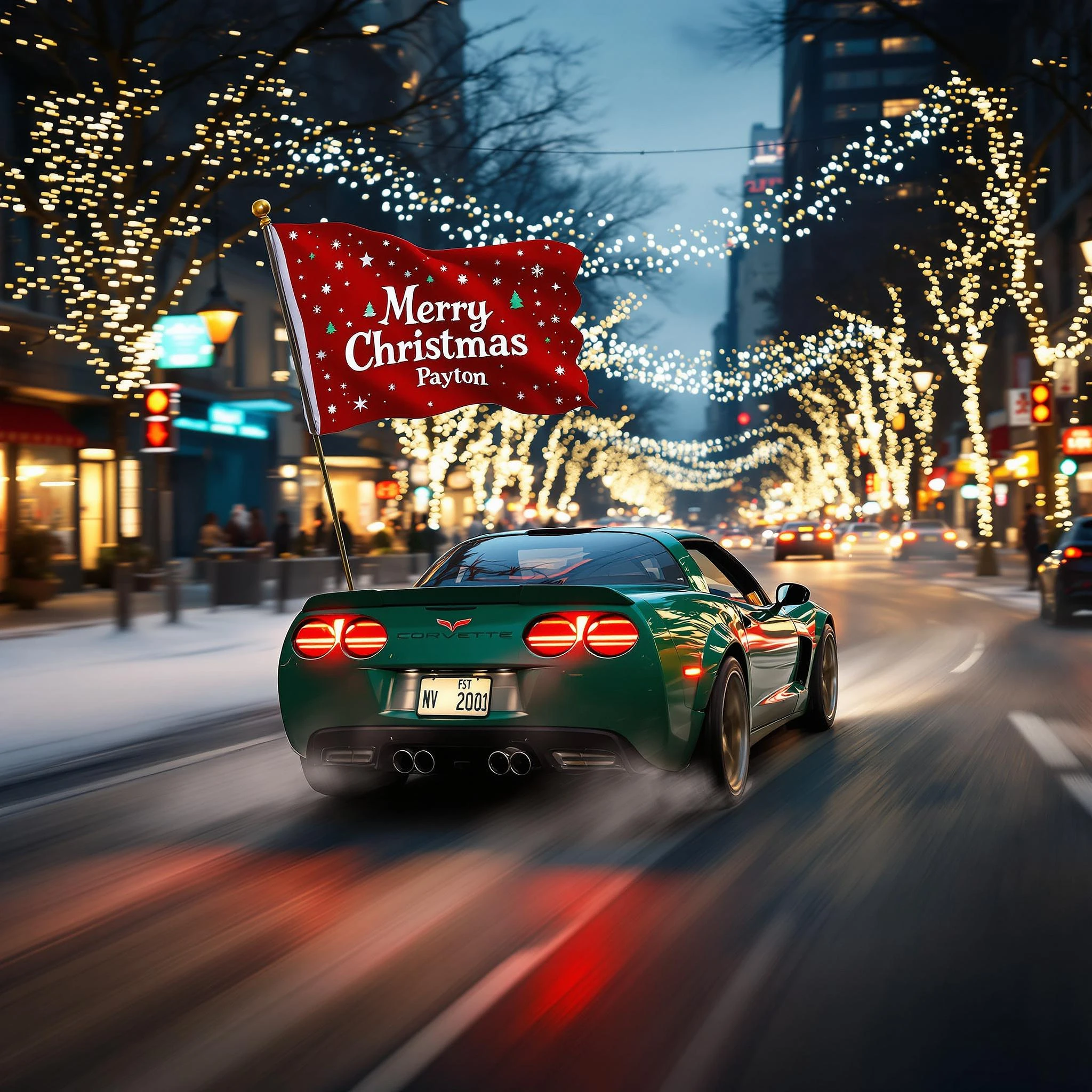 Create a cinematic and realistic image of a British racing green 2000 Corvette racing through the streets. The car should have a flag stick off the rear hatch with a festive Christmas flag displaying the message "Merry Christmas Payton" clearly. The streets should be bustling with holiday decorations and lights, and the background should be slightly blurred to emphasize the speed of the racing Corvette. Ensure high detail and ultra-realistic rendering to capture a dynamic, festive atmosphere.
