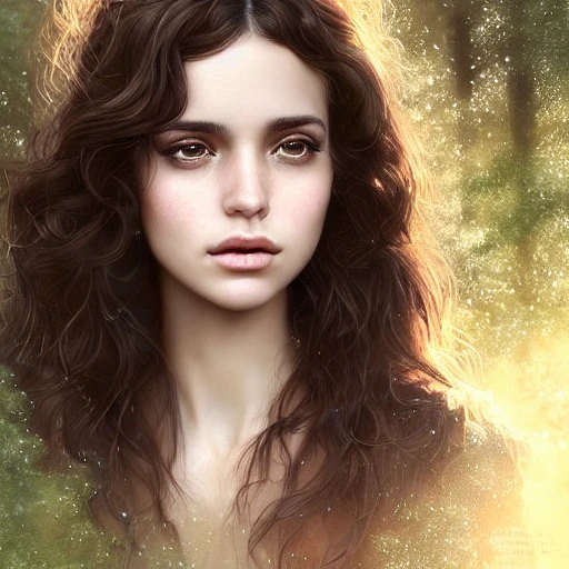 cute spanish girl, wavy dark hair, looking at camera with luminous brown eyes, curly shoulder length hair, beautiful, symmetrical face, in a forest, cinematic lighting, hyperdetailed, cgsociety, 8k, hires, Charlie Bowater, Tom Bagshaw , unique face, incredibly detailed and intricate, beautiful, elegant, golden ratio, white fractal background, vfx, post-processing --ar 6:9 --test --uplight