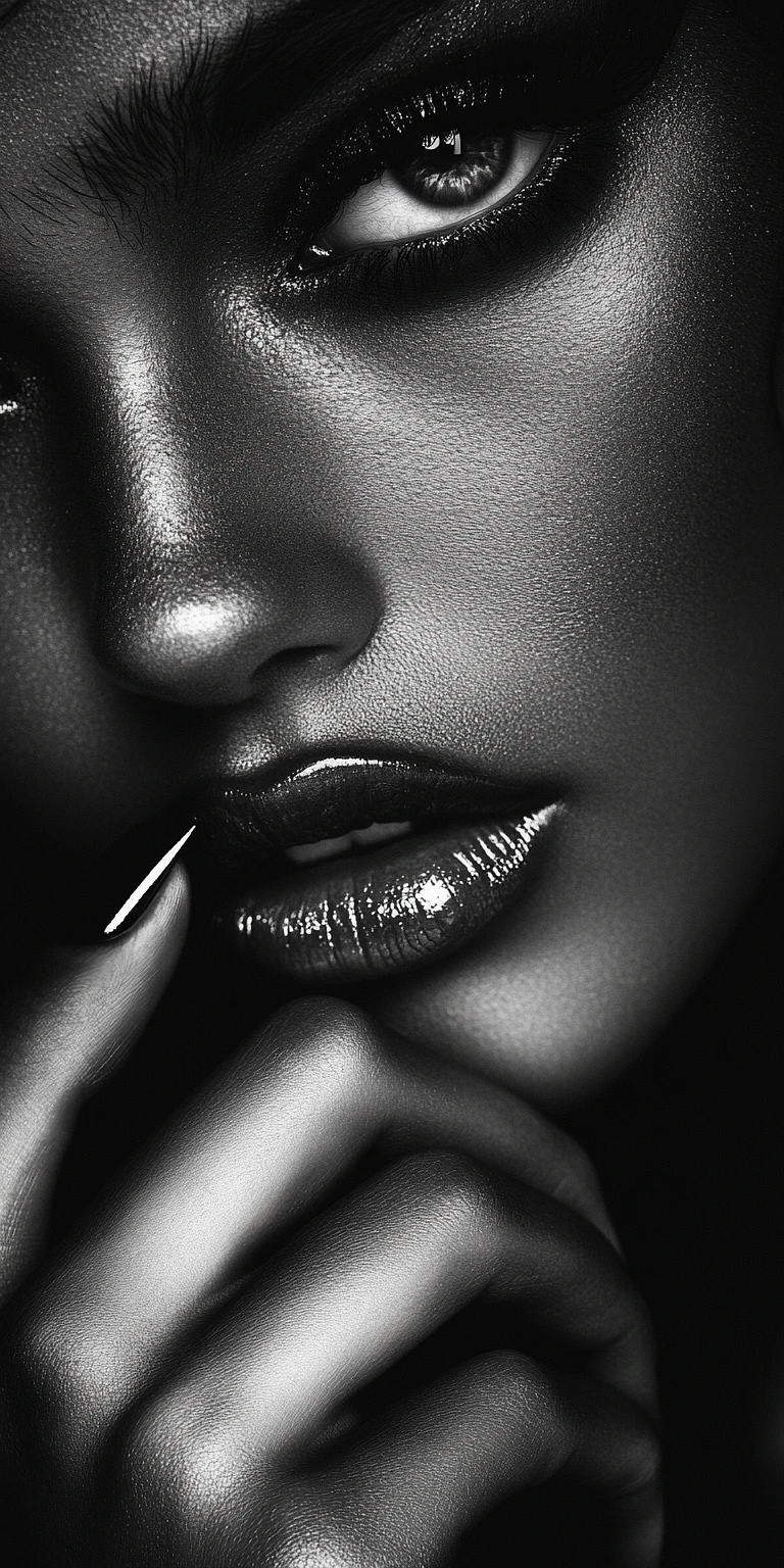 A black-and-white portrait of an African American woman with her hand touching her lips. This is a work of beauty photography, likely for a beauty campaign or Vogue cover photo. The close-up shot features hyper-realistic skin with a very detailed texture, beautiful lighting on the face, soft shadows, smooth lighting, and sharp focus. The centered composition and professional color grading result in a high-sharpness image. --v 6. 1