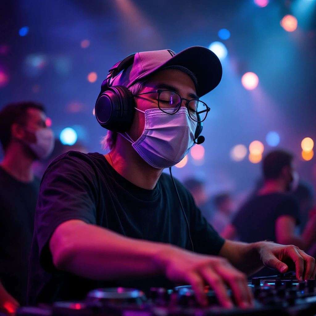 An asian, closed eyes, DJ with a face masked and glasses wearing a baseball cap, gray-silver hair and a black T-shirt, headphones, entertainment at a vibrant party nightclub, cinematic lights,
