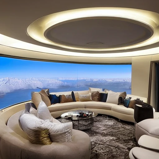 This luxurious living room on a space ship boasts a panoramic window that wraps around one entire wall, offering a stunning view of the earth and the stars beyond. The furniture is plush and inviting, with plush sofas and armchairs upholstered in soft, cream-colored fabric. A large, rectangular coffee table made of clear glass sits at the center of the room, and a few decorative pillows add pops of color. A few high-tech gadgets, such as a holographic display and a floating shelf, add a futuristic touch It's dark outside, and there are two men and women inside. There are two men and women standing in the spaceship.