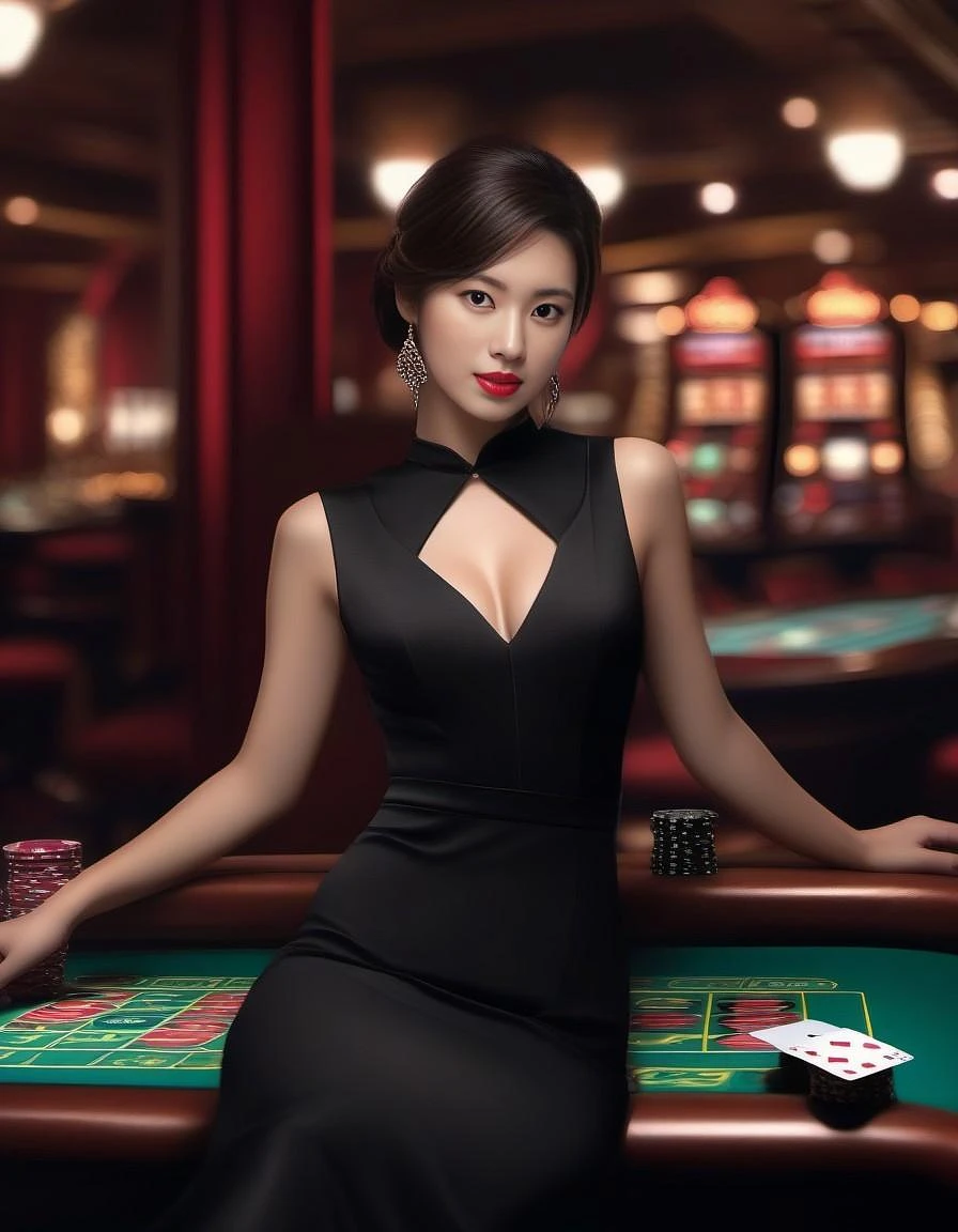 Modelshoot style, (extremely detailed CG unity 8k wallpaper) full body black and white photo of the most beautiful woman in the world, (medium shot:1.4) , (extreme close up:1.3) , (Film stock) , (film grain:1.5) , beautiful femme fatale sitting on a black jack table, (blush) ((black hair) ), (ponytail hair:1.3) , (dark eyes) , ((detailed symmetrical face) ), (pretty face) , Mascara, reflective eyes, makeup, (red lipstick) , (white sclera) , cute nose, (open mouth smile) , teeth, (hair accessories) , rim lighting, dramatic lighting, chiaroscuro, ((black cocktail dress) ), (backless dress) , ((stockings) ), (expensive jewelry) , blackjack table, (high heel ankle boots:1.2) , (thighs) , legs, (casino:1.3) , las vegas, slot machines, cards, ((chromatic aberration) ), (from above:1.3) , professional majestic impressionism oil painting by Waterhouse, John Constable, Ed Blinkey, Atey Ghailan, by Jeremy Mann, Greg Manchess, Antonio Moro, trending on ArtStation, trending on CGSociety, Intricate, High Detail, dramatic, trending on artstation, trending on CGsociety