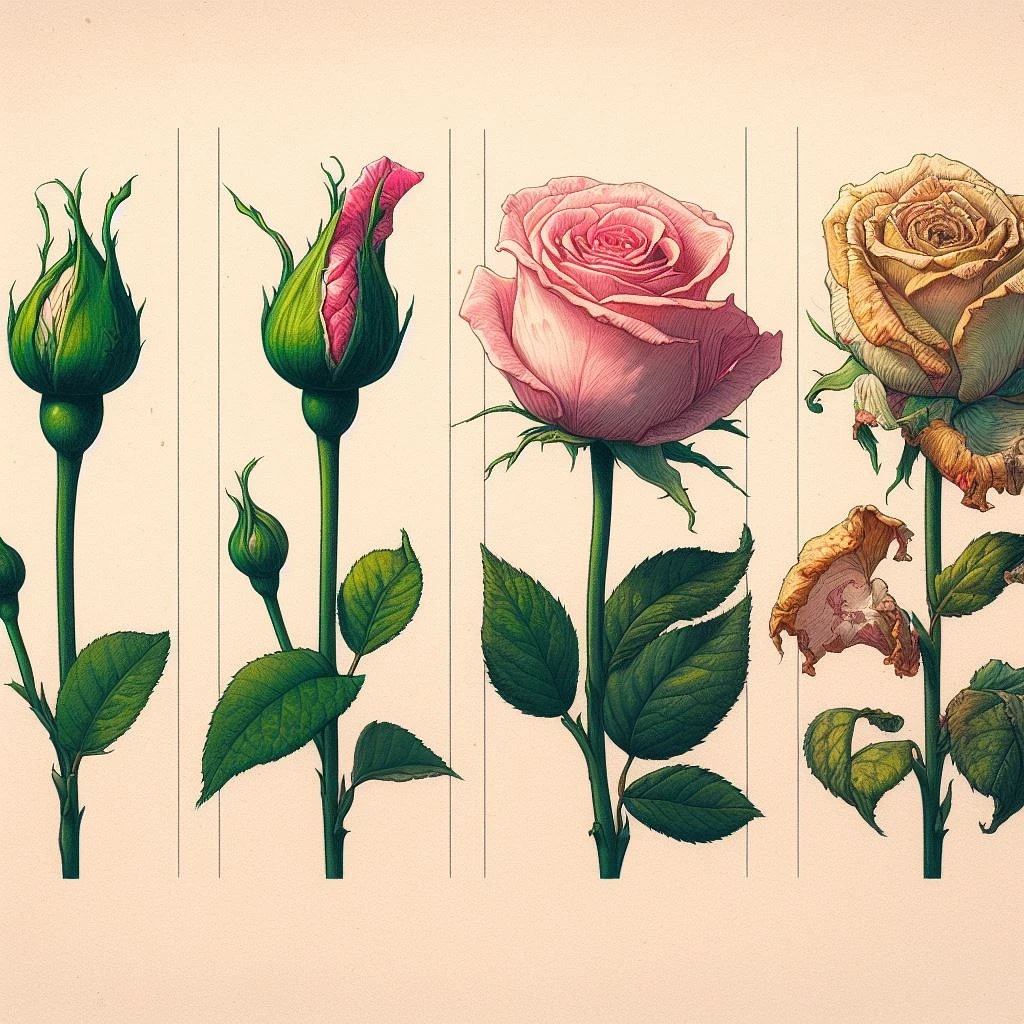 Four images side by side illustrating the life cycle of a rose: A small, tight green bud with tiny leaves. The bud starts to unfurl, revealing delicate petals and a richer hue. A full bloom, radiant in its prime, petals spread out in all their glory. Fading elegance as petals wilt, turn brown, and fall.