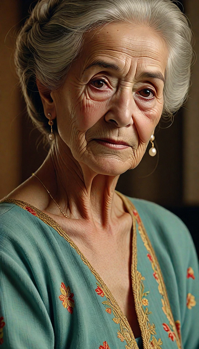 An elderly woman expressing a mix of nostalgia and contentment. Wisdom and life experiences through facial details. elegant (((masterpiece) )), UHD