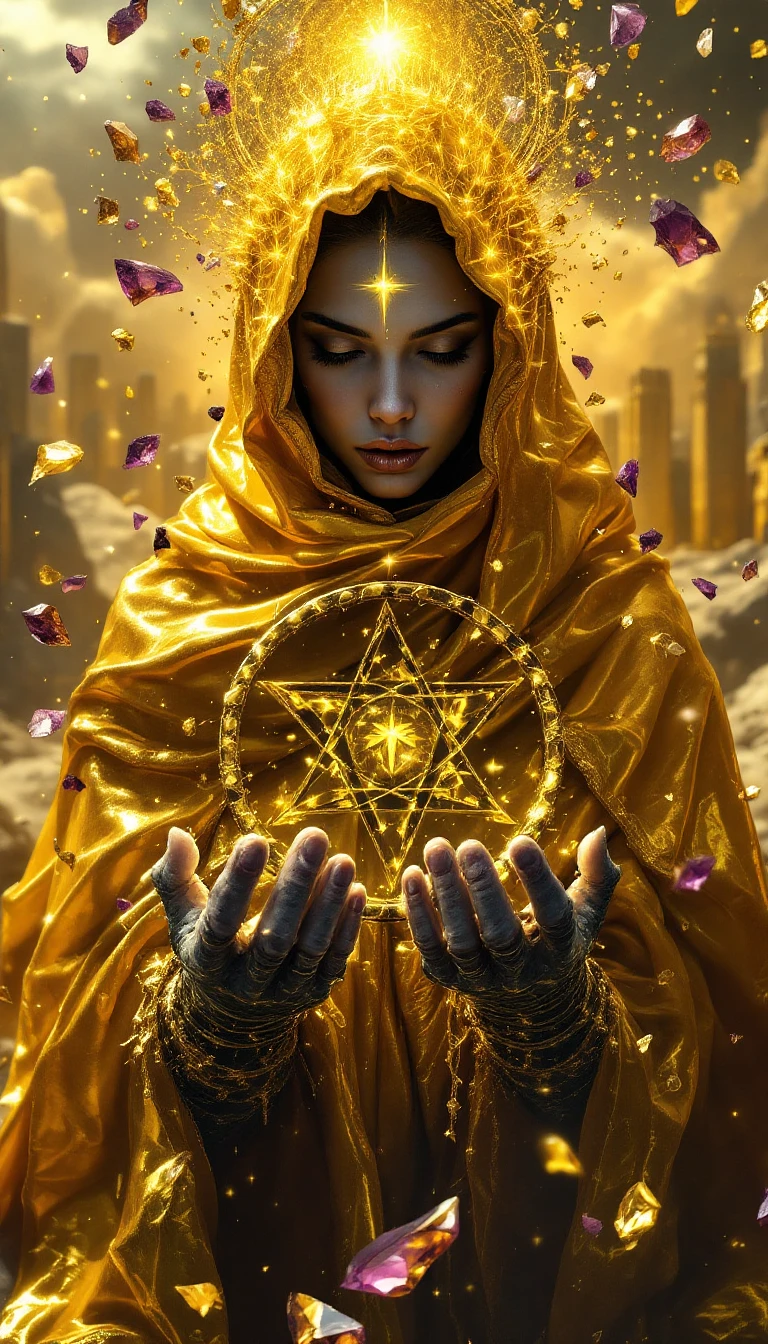 A regal figure cloaked in a liquid gold mantle clutches four crystalline pentacles, their hands tight with a blend of reverence and fear. Their lower body dissolves into petrified stone, a haunting symbol of the weight and stagnation of material attachment. In the distance, a golden celestial city glimmers—inviting yet unreachable—floating beyond the grasp of the figure.