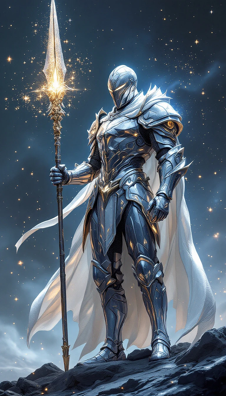 A celestial knight with silver armor that reflects the cosmos, standing poised with a spear made of stardust, in the style of Sci-Fi Fantasy, focusing on sleek, futuristic designs and a powerful presence. --ar 71:128 --stylize 750 --v 6