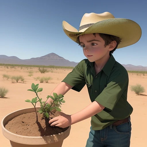 Photo of a ultra realistic of a boy in green shirt and cowboy hat, planting an acacia tree in the chihuahua desert, with dune foothills