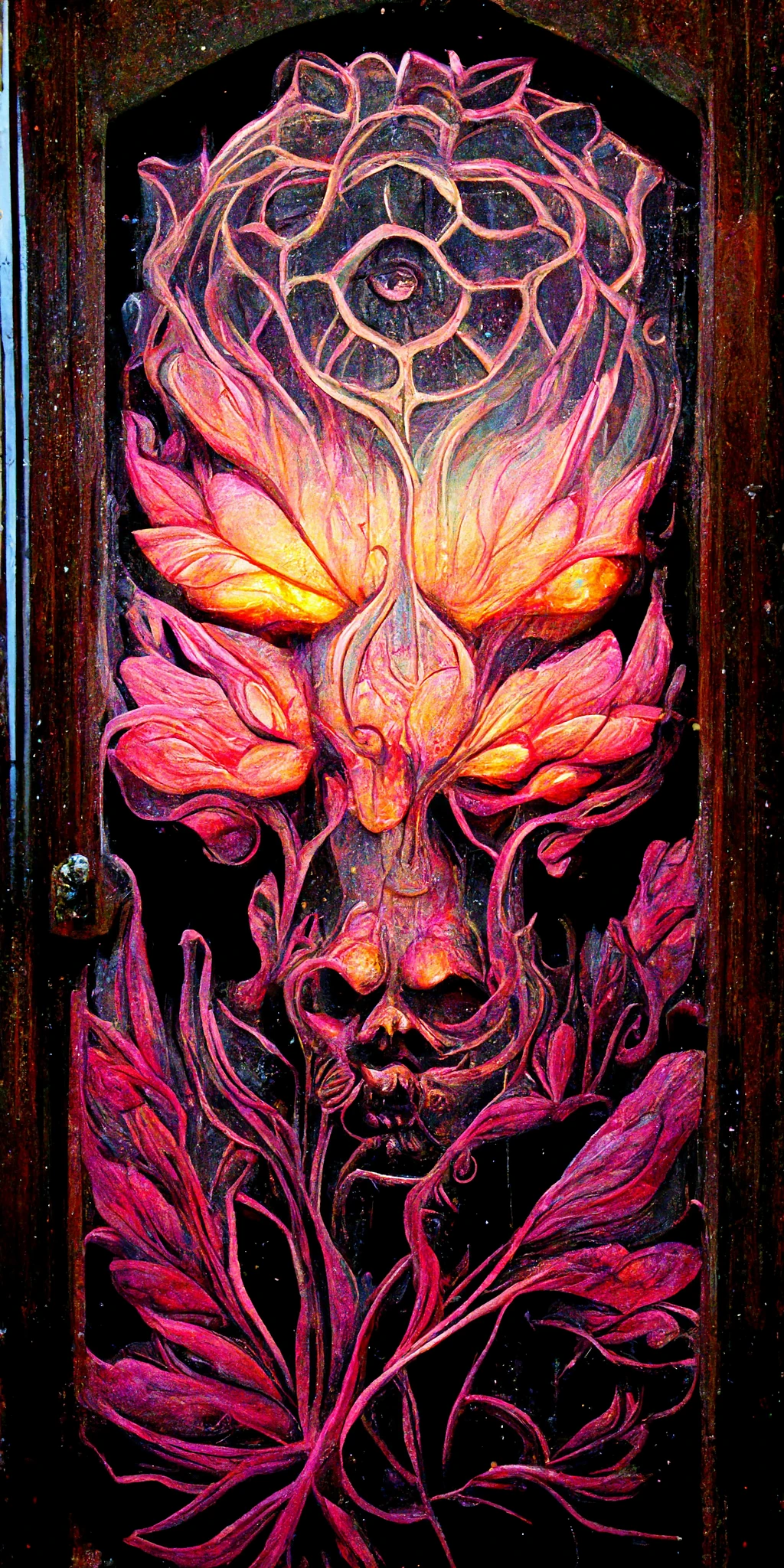 Painted Obsidian relief carving in an old wooden door, of Flowerpunk Goddess of Enlightenment, explosion of flowers, inner illumination, neon wires, intricately carved, fractal, tarot, black ink, holi festival of Synthwave color, crystalline fractal kintsugi, intricate details, cinematic lighting, by mohrbacher and alphonse mucha, Synthwave colors, post-processing --ar 1:2 --no defocus blur