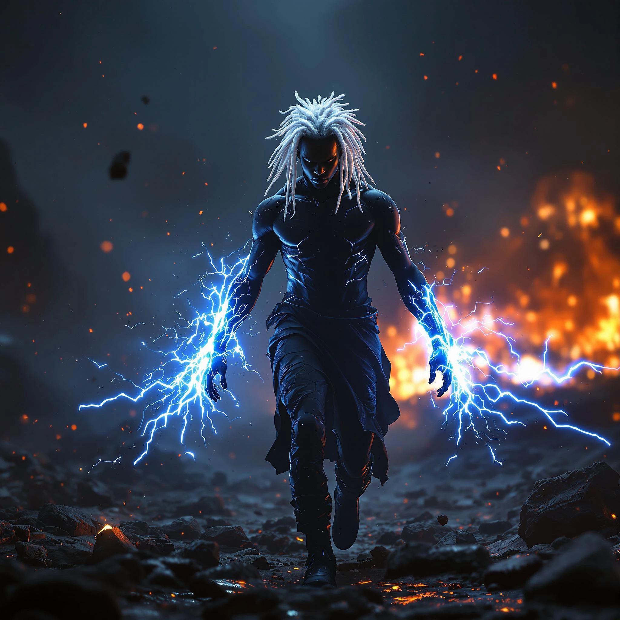 front view of a PHOTOrealistic african american superHERO with white glowing short dreadlocks, his body is covered in pitch black dark shadows and the shadows are filled with outer space and the galaxy walking towards the camera as the ground is exploding and rocks are flying in the air and blue electrical energy surges along his arms, dramatic light, cinematic lighting, extreme details, unreal engine 5, cinematic