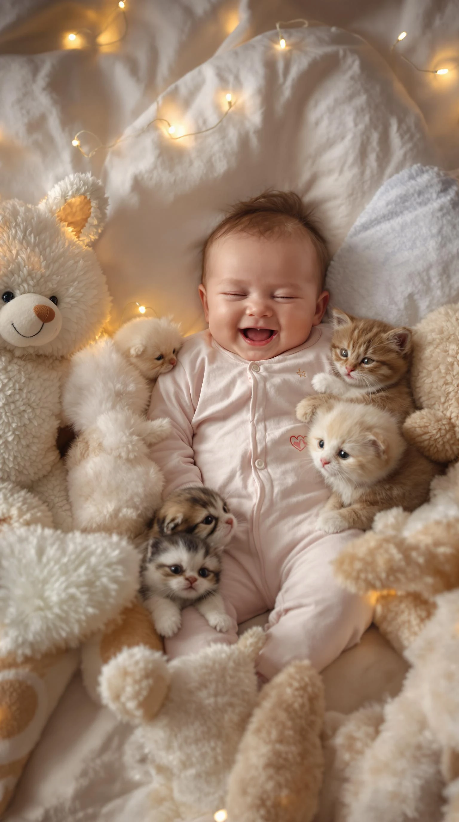 A hyper-realistic image of an adorable baby in soft pajamas, lying in a cozy bed surrounded by fluffy baby animals—kittens, puppies, and bunnies all snuggled up together. The baby is giggling while a mischievous kitten playfully nudges a puppy, causing a little chaos. Warm fairy lights glow softly in the background, a plush teddy bear sits beside them, and the blankets are extra fluffy. A heartwarming, magical moment of innocence and comfort. UHD --ar 9:16 --v 6. 1