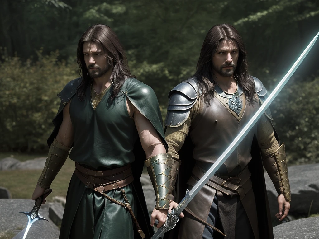 a pivotal scene where King Arthur pulls the sword Excalibur from a stone. The man on the left has dark hair, a brown tunic, and a leather vest, with a sword at his side. The man on the right has dark hair and a black robe. The sword, positioned between them, has a glowing green blade and a golden hilt. The background features a forest with tall trees and a bright sky. The image has a wide-angle perspective, with a slight blur effect, suggesting a vintage camera style.