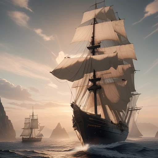 Photo of a ultra realistic sailing ship, dramatic light, pale sunrise, cinematic lighting, battered, low angle, trending on artstation, 4k, hyper realistic, focused, extreme details, unreal engine 5, cinematic, masterpiece, art by studio ghibli, intricate artwork by john william turner
