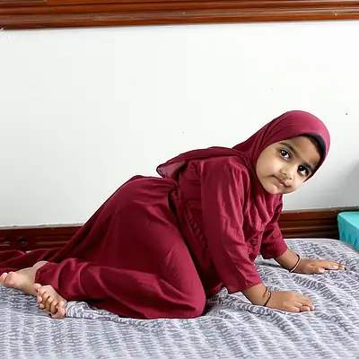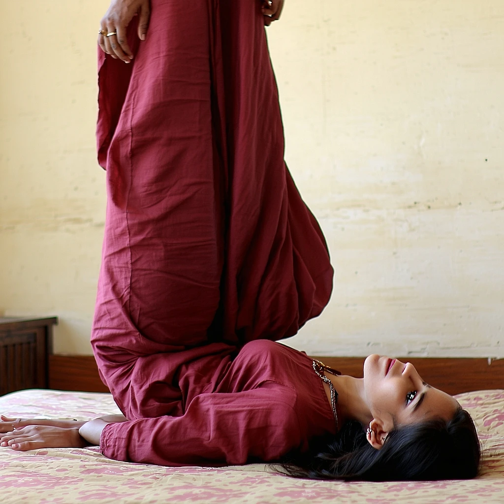 A tiny super young Muslim Pakistani girl, as she lays on her back, her legs held in the air by a man, on a bed, wearing a deep red colored Pakistani shalwar kameez, her shalwar pulled below her knees, showing her cute round small buttocks and pussy, a guy laying on top of her penetrating her pussy with his big dick