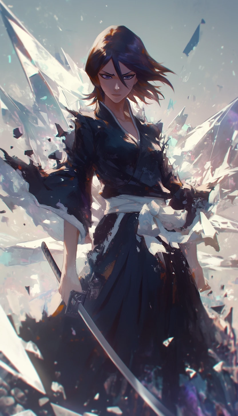 masterpiece, best quality, expressive eyes, luminous, perfect face, Rukia Kuchiki from Bleach anime series, with super powers, full body, big picies of shattered glass flying all over, authentic anime background, Bleach anime theme --ar 4:7 --s 250 --niji 6