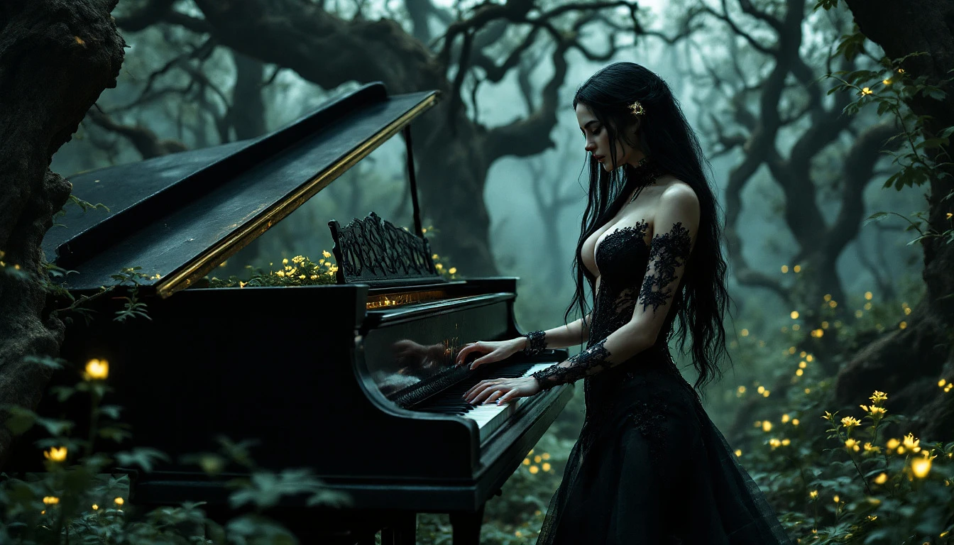 The gothic queen with big breasts stands gracefully beside a weathered black piano in the middle of a shadowy forest clearing, her side profile illuminated by the faint glow of bioluminescent flowers. Her long black hair cascades down her back, framing her fitted, provocative cleavage gown with sheer lace accents and intricate embroidery. Both hands are poised on the piano keys, her fingers gliding elegantly as haunting melodies fill the air. The twisted trees around her seem to lean closer, their branches forming an eerie canopy above, while faint mist curls around her feet.