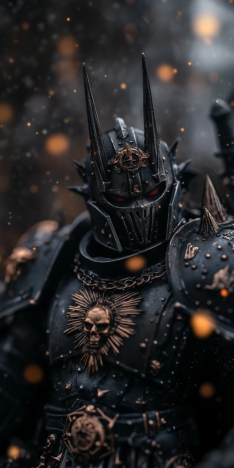 A dark, menacing armored figure stands prominently, showcasing an intricate design with sharp angular features. The armor is a deep black, accentuated with ornate bronze details, including skull motifs and sunburst patterns. The helmet is topped with long, pointed spikes, and the eyes glow ominously red, adding an unsettling aura. A thick chain hangs around the neck, enhancing the imposing presence. Soft bokeh lights in warm tones subtly float in the background, creating a dramatic atmosphere that emphasizes the character's formidable nature. The scene captures a blend of gothic and fantasy elements, drawing the viewer into a world of dark allure. --ar 1:2 --style raw --v 6. 1