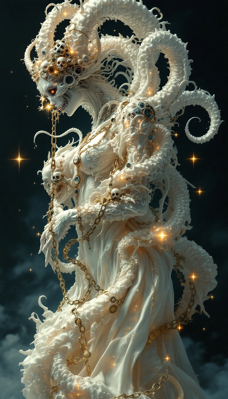 "Celestial Descent: Pearl and Shadow": A hyper realistic and ultra detailed photorealistic horrorcore picture showcases a powerful, but insane female figure, a rottencore fractal entity, with a long, flowing white gown with subtle bone decorations, and a crown made of skulls. She is adorned with sacred geometry tattoos that glow with a luminous pearl sheen, playing a fractalized zither in intense poses, and presented with an oblique shot view. Her frame spirals and writhes while she is bound by heavy golden chains and pocket watches in a mandelbrot fractal set, curling and swirling downwards. The piece is done with crystal clear imagery, using ray tracing and global illumination for a deeply detailed, layered look, and conveying an illusion of three-dimensionality throughout.