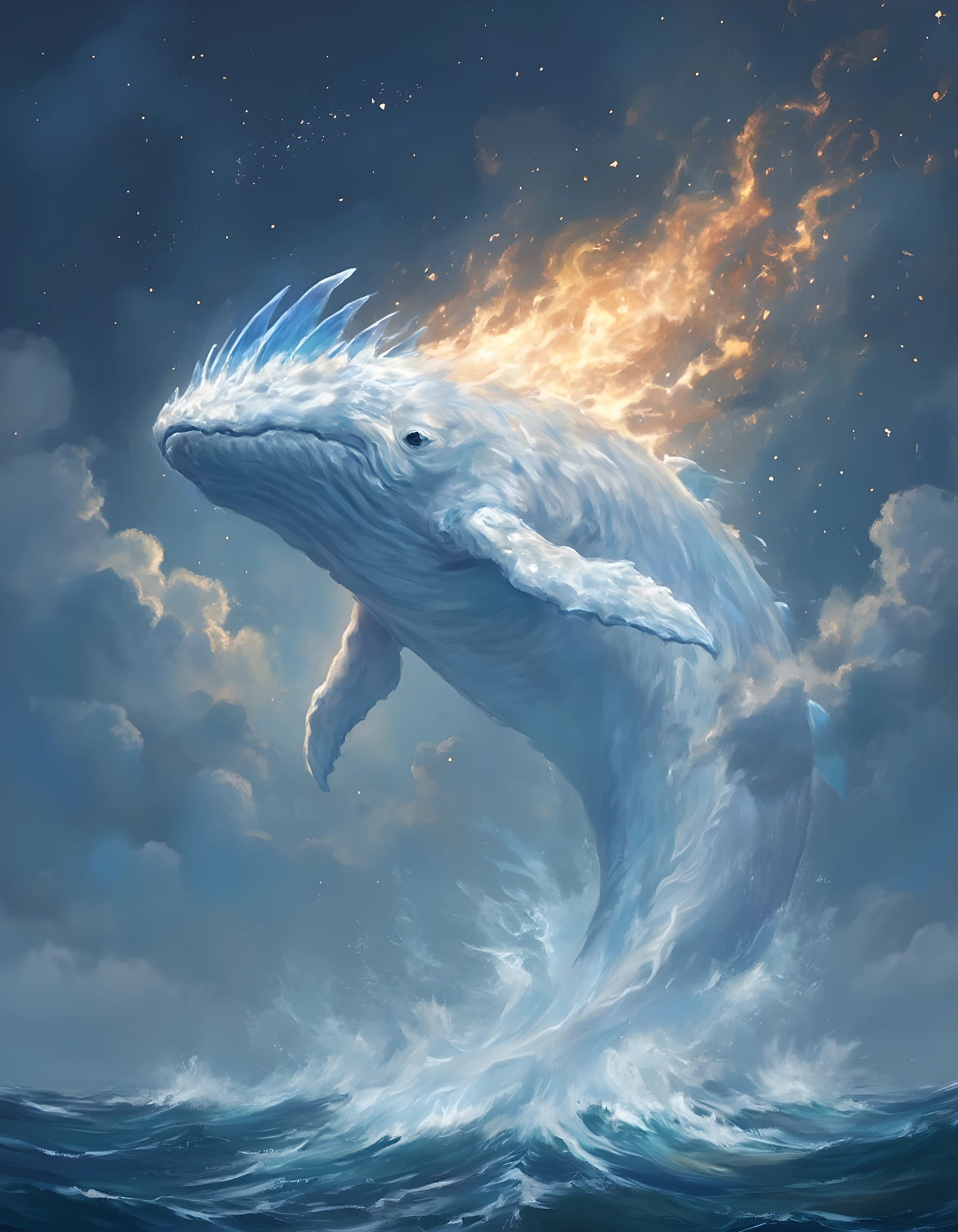 A colossal, white whale-like creature with blue fins emerges from the ocean, surrounded by golden flames and stars. The scene is set against a dramatic night sky with swirling clouds. ] [Fantasy art, mythical art, creature design, digital painting] [Inspired by fantasy illustrations, mythical creatures, and digital painting techniques, focusing on creating a sense of awe, wonder, and cosmic scale.] [Digital painting with a focus on textures, lighting, and atmospheric effects. The color palette is dominated by whites, blues, and golds, creating a celestial and ethereal atmosphere. The composition is centered around the whale-like creature, emphasizing its immense size, otherworldly beauty, and connection to the cosmos. The mood is awe-inspiring, mysterious, and slightly surreal, suitable for an artwork exploring themes of creation, wonder, or the vastness of the universe.