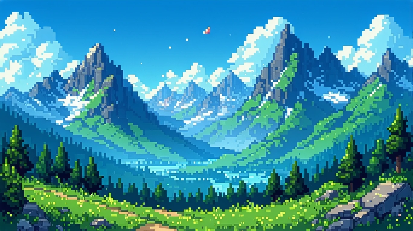 immagine che deve fare da sfondo per un videogioco a scorrimento orizzontale 2D, cerca di usare una risoluzione di 1280 x 720. l'immagine deve contenere: delle montagne, un cielo e in generale deve essere una prospettiva alta come se stessimo in volo. l'immagine non deve contenere: acqua, un pavimento visibile da vicino o comunque del terreno vicino nella parte sottostante dell'immagine . stile: pixelart