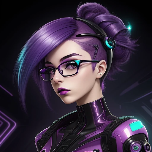 a girl with purple hair dressed in glasses, in the style of futuristic digital art, flowerpunk, shiny/glossy, dark teal, black and pink, charming characters, lively colors, forward facing
