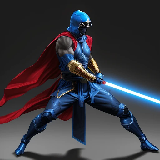 a tall black and blue ninja that looks like sub-zero with a sword and red belt, who is up against a a man in a RED SPANDEX SUIT, WITH GOLD GLOVES AND BOOTS , wearing a RED ranger helmet HOLDING a lightsaber