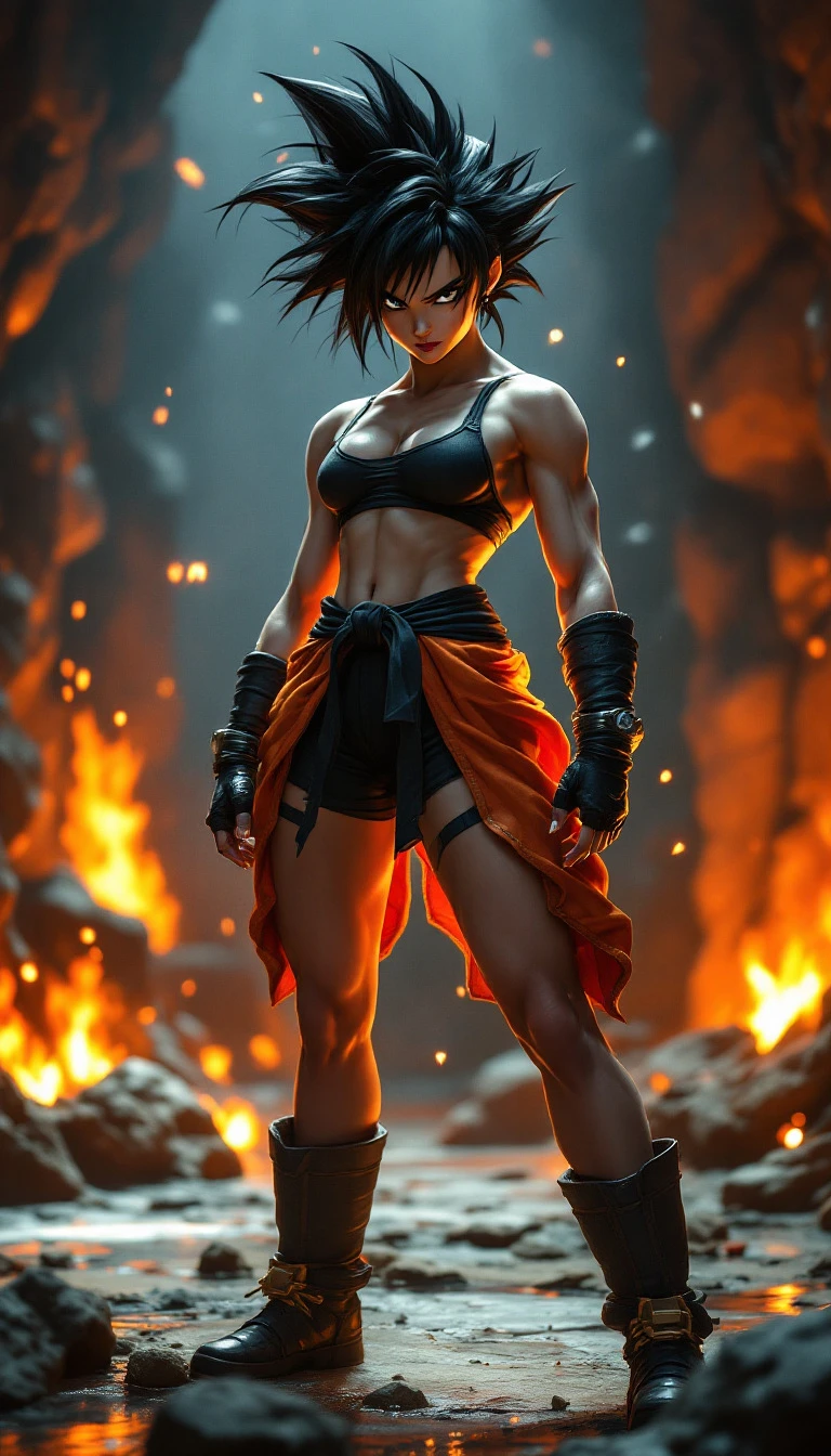 Masterpiece, Cinematic, Highly Detailed, 8K, HDR, Sharp Focus, Dynamic Lighting. In reference of the Dragonball Z Universe, gender swap of the main character Goku/Kakarot into, a strong powerful athletic muscular build female, with spiked but fashoned black hair, very toned and defined muscles, visible six pack abs, wearing weighted gloves and shins and boots, having a tank top and short shorts with a weighted belt, training in the hyperbolic time chamber in the fire/ice area charging up a Kamehameha,