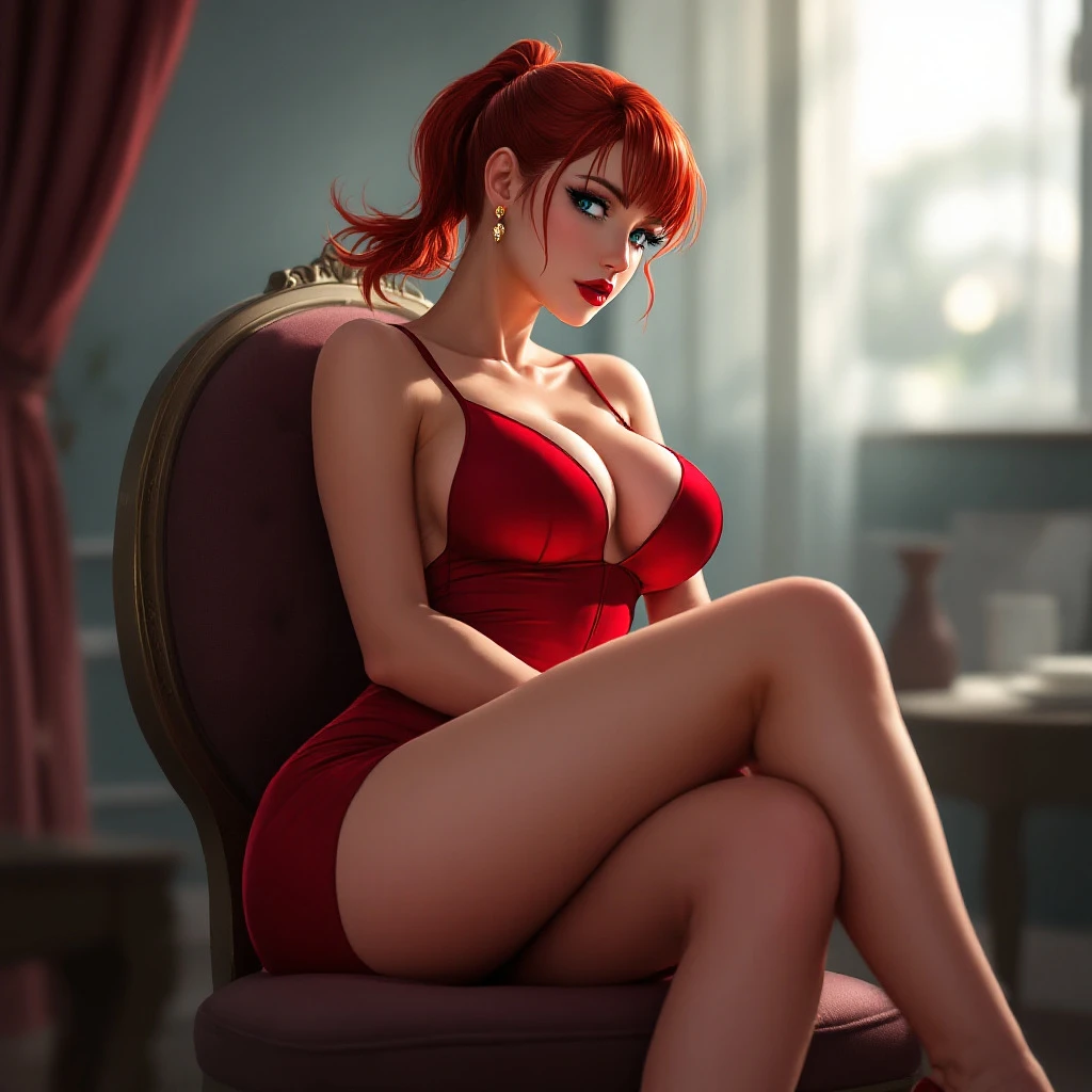 anime, woman, red hair, short ponytail, cyan eyes, red lips, red bodycon dress, tight dress, red high heels, sitting on a chair, sitting with legs crossed, earrings, bare legs, closed cleavage, massive chest, bare arms, with straps