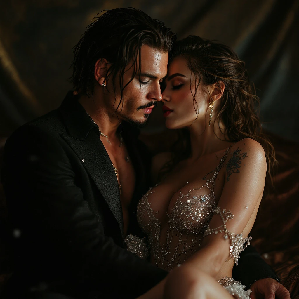 full body , fantasy, Margot Elise Robbie and John Christopher Depp II, hardcore sex, (Sex Positions: suck dick) , erotic modelpositions, Covered in sweat, wet hair, Cinematic Lighting, ethereal light, intricate details, extremely detailed, incredible details, full colored, complex details, insanely detailed and intricate, hypermaximalist, extremely detailed with rich colors. masterpiece, best quality, aerial view, HDR, UHD, unreal engine. plump looking at the camera, smooth thighs, (glittery jewelry) ((acrylic illustration, by artgerm, by kawacy, by John Singer Sargenti) dark Fantasy background, glittery jewelry, Representative, fair skin, beautiful face, Rich in details High quality, gorgeous, glamorous, 8k, super detail, gorgeous light and shadow, detailed decoration, detailed lines)